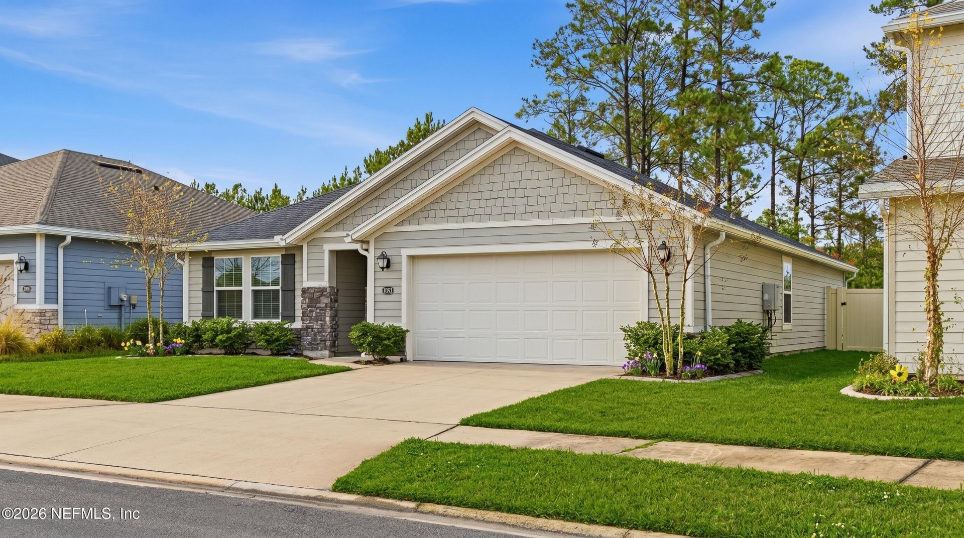 Welcome to this beautifully upgraded 2023 smart, energy-efficient ranch home offering over $60K in thoughtful enhancements, ideally located in a highly desirable community with low HOA and no CDD fees, just minutes from Oakleaf Plantation Town Center for shopping, dining, and entertainment. From the moment you enter, you'll appreciate the soaring 10' ceilings, abundant natural light from added windows, and luxury vinyl plank flooring throughout, creating a bright and inviting open-concept living space. The chef's kitchen is the heart of the home, featuring upgraded shaker cabinetry with soft-close doors, quartz countertops, added cabinetry, a custom island drawer bank, and premium Samsung Bespoke appliances, designed for both everyday living and entertaining.This home is fully equipped with modern smart features including Philips Hue lighting throughout (interior and exterior), smart switches, smart thermostat, Chamberlain smart garage door opener, and full Ethernet/coax wiring with a dedicated network closet, offering seamless connectivity and control. The primary and secondary bedrooms showcase upgraded tile shower and tub surrounds, while additional comforts include a tankless water heater and whole-home water softener. Step outside to your private backyard retreat featuring an extended 11x22 covered patio with pergola, natural gas grill hookup, permanent soffit lighting, smart irrigation system, and fully fenced yard with vinyl and aluminum fencing backing to a serene preserve. The yard also includes newly planted peach trees that are currently maturing, adding future charm and potential to outdoor space. Additional upgrades include enhanced laundry storage, garage sink, upgraded master closet system, faux wood blinds throughout, and Energy Star certification with pre-treated wall framing for added peace of mind. This home blends modern design, smart technology, and high end upgrades throughout truly move in ready and a must see!