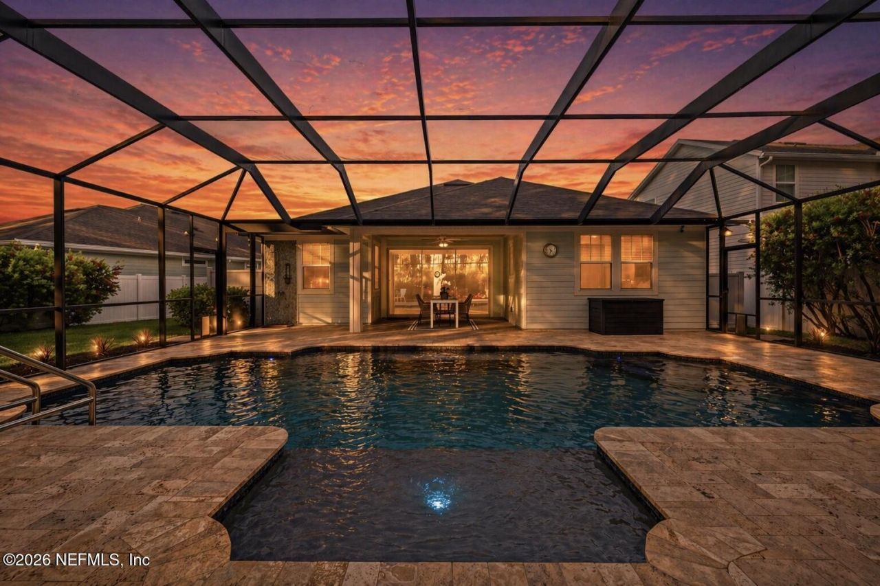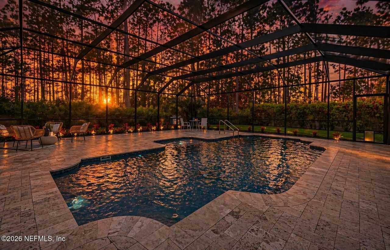Your lifestyle is non negotiable!Your private boutique backyard sanctuary awaits in the prestigious community of Palencia! This meticulously maintained, move-in ready, single-story Pulte pool home offers three bedrooms, two full baths and an extended two-car garage. Home sits on one of the most coveted premium lots at the end of a cul de sac road. Originally built with the builder's luxury package, it has been lovingly lived in and transformed by the original owners into a true custom residence, blending thoughtful function, high-end finishes, and seamless indoor-outdoor living. The showstopper is the fully fenced backyard oasis, featuring a perfectly centered, heated, 10,000-gallon saltwater pool and an expansive approximately 1600 sq ft screened lanai surrounded by palm trees and breathtaking views of tall pines, mature palms, flowering bottlebrush, and a protected preserve. You will be greeted by this ''wow'' view from nearly every angle of the main living spaces thanks to soaring dual-side-access triple sliding glass doors. The backyard oasis features herringbone-patterned travertine decking on a solid concrete base, a 20' x 40' screen enclosure, a pebble-tiled outdoor shower with hot water, handheld and rain showerheads, natural gas hookup for grilling under the lanai plus a separate rear grilling deck with electricity and water, and an extra-large side yard perfect for pets or play. As you step inside, you are welcomed by unobstructed views of the pool and backyard oasis. The heart of the home is the sophisticated open-concept floor plan with a dramatically expanded kitchen that has been renovated to nearly double its original size, designed for everyday convenience and effortless entertaining, featuring solid wood cabinets with dovetailed, soft-close drawers, pull-out cabinetry for spices, gadgets, pots, pans, and garbage and recycling, stainless steel appliances including a built-in counter-depth refrigerator and vented hood over an electric range with a plug-and-play natural gas bib already installed behind it, upgraded quartz countertops with open-concept bar seating, and a built-in breakfast nook. Additional owner-added luxuries include a four-foot garage extension with wall-mounted storage cabinets, two custom closets in the garage, non-skid flooring, attic stairs leading to a massive storage room, and a professionally designed sprinkler system fed by a 500-foot artesian well for clean, rust-free, low-cost watering. Flooring is upgraded to porcelain wood-plank tile and premium 100% Triexta carpet. The primary en suite features a thoughtfully upgraded super shower, separate water closet, dual vanities, and custom storage, along with a professionally designed walk-in closet with soft-close drawers and generous shelving. The guest bedroom doubles as an office with a built-in desk, wall cabinets, and a queen-sized Murphy bed. The laundry room is beautifully upgraded with cabinets, countertops, and a sink. As part of the exclusive Palencia community, enjoy world-class amenities and resort-style living including three community pools with one heated Olympic-sized lap pool, more than 30 acres of parks, 10 miles of trails, a stunning mile-long boardwalk to a private intracoastal fishing pier, 18 holes of championship golf with membership required, a 10-acre athletic complex, tennis and pickleball courts, a Pirate Park, a dog park, and a world-class fitness center complete with a Zen Room, steam rooms, saunas, and a full schedule of